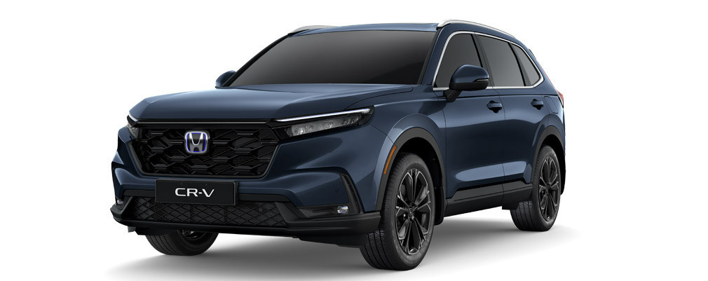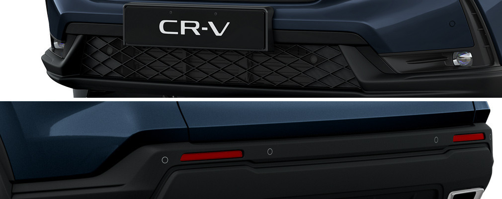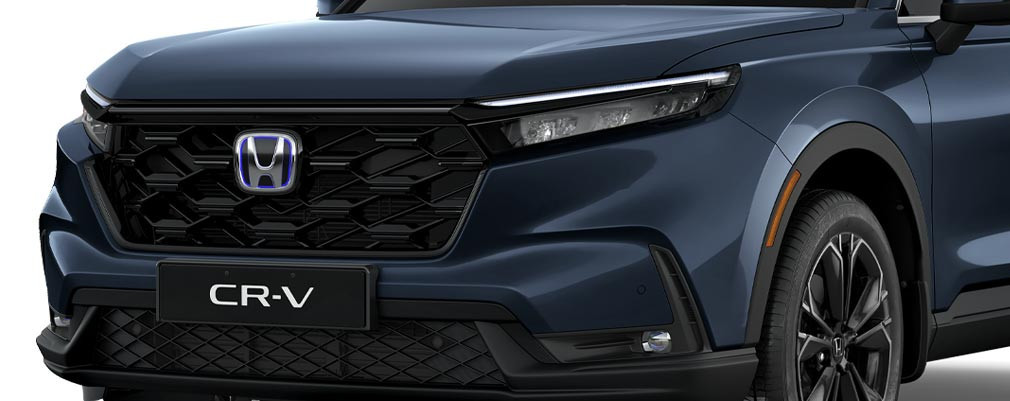 Frente agresivo y moderno con parrilla prominente, con acabado tipo panal de abejas, un capot largo que se funde con su deportiva defensa frontal con detalles en color negro que crean una sensación de mayor robustez. Logo distintivo de Honda, donde se aprecia el color azul característico de vehículo híbrido con la exclusiva tecnología e:HEV de la marca.