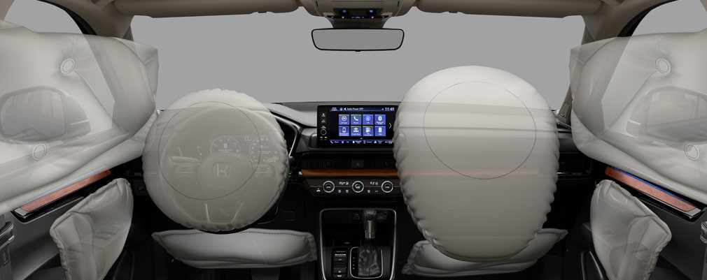 La CR-V Advanced Hybrid está equipada con un completo sistema de 10 airbags; delanteros SRS (2), laterales (2), delanteros para rodillas (2), de tipo cortina con sensor de vuelco (2) y sistema airbags laterales para pasajeros de segunda fila (2). Cuenta con asientos con anclajes ISOFIX (en asientos traseros), sistema estabilizador del vehículo (VSA®) con control de tracción y estabilidad, sistema AHA (Vehicle Handling Assist o Asistente de Conducción Ágil) y sistema de monitoreo de la presión de los neumáticos (TPMS).