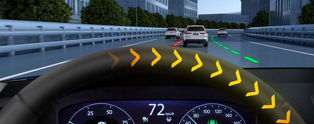 Este sistema ayuda a mantener el vehículo dentro del carril demarcado a partir de los 70 km/h. Puede corregir levemente la trayectoria aplicando un giro correctivo para ayudar al conductor a mantenerse en las líneas correctas.