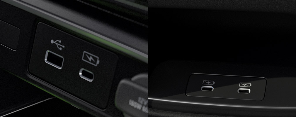 Puertos USB delanteros (2) y traseros (2) iluminados, de carga rápida y fácil acceso.