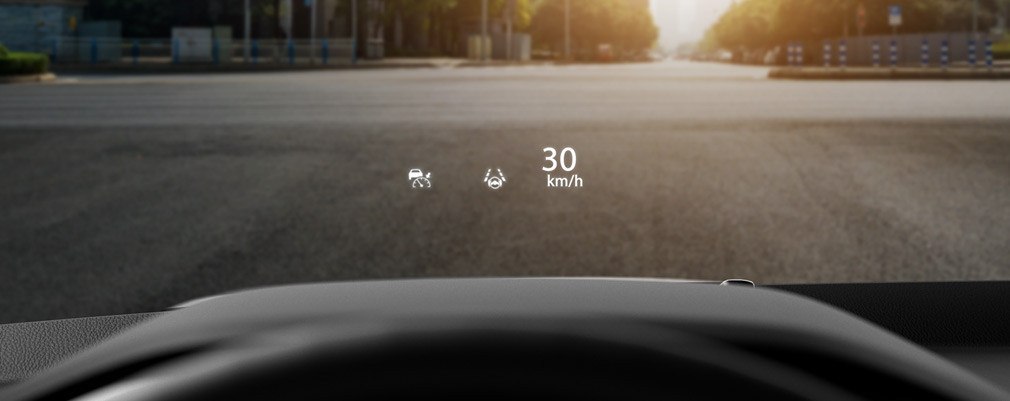 CR-V Advanced Hybrid te permite ver información esencial para la conducción proyectada en el parabrisas sin apartar la vista de la carretera.